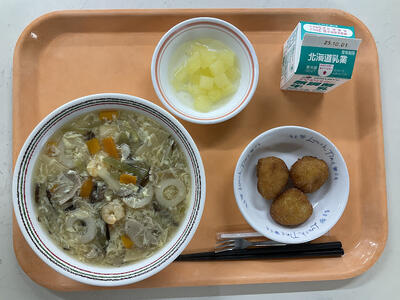 がたたんラーメン・揚げいも・りんご缶・牛乳