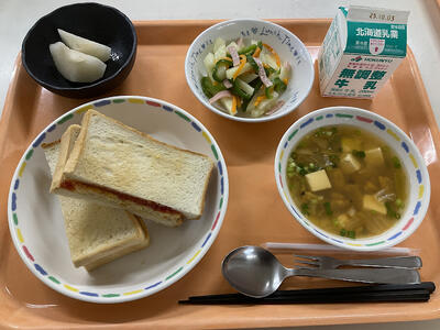 韓国式トースト・あさりと豆腐のキムチスープ・じゃがいものナムル・なし・牛乳