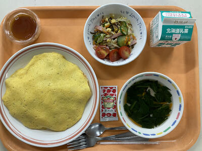 お絵かきオムライス・ほうれん草スープ・元気サラダ・手作りプリン・牛乳