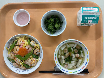 「えび」がたっぷりのちらし寿司を食べて、桃の節句をお祝いしました。「えび」には、長生きするようにという意味が込められています。