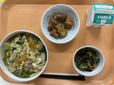 親子うどん・ちりめんとわかめの酢の物・おさつフリッター・牛乳