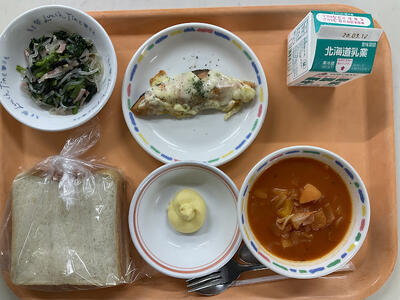 スライスパン・具だくさんミネストローネ・鮭のチーズ焼き・小松菜サラダ・カスタードクリーム・牛乳