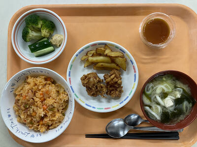 ケチャップライス・豆腐のみそ汁・ざんぎ・フライドポテト・スティック野菜みそ・プリン・麦茶