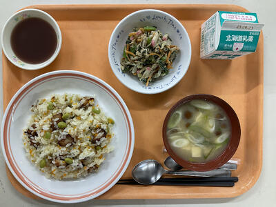 山賊焼きチャーハン・なめこのみそ汁・きのこのサラダ・水ようかん・牛乳