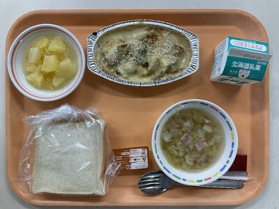 スライスパン・キャベツスープ・根菜のブリみそグラタン・パイン缶・はちみつマーガリン