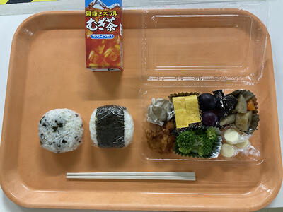 おにぎり・鶏の唐揚げ・卵焼き・しゅうまい・根菜煮・ぶどう・麦茶