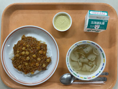 ひよこ豆のキーマカレー・かぶのスープ・豆乳プリン・牛乳