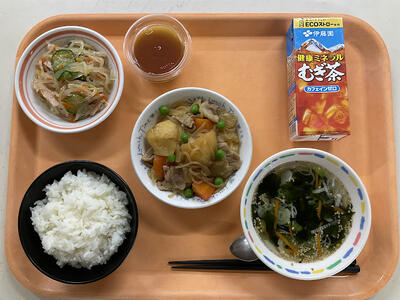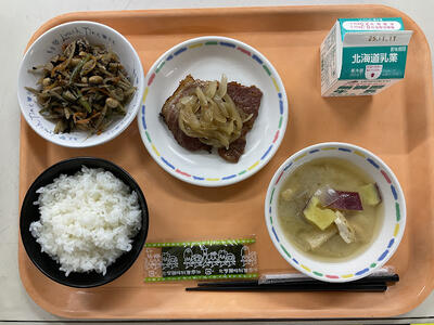 ごはん・さつまいも汁・豚肉の生姜焼き・かみかみ金平・味のり・牛乳
