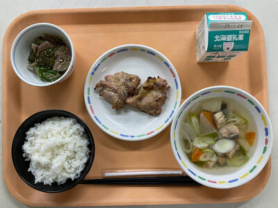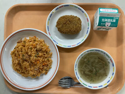 チキンライス・がごめ昆布入り野菜スープ・道南ポテトのコロッケ・牛乳