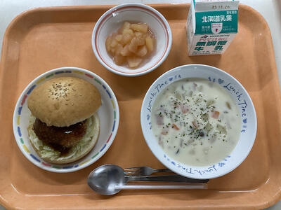 ぶりカツバーガー・たまふくら大豆のチャウダー・七飯りんごのコンポート・牛乳